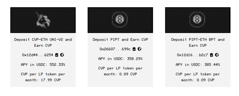 To get CVP through liquidity mining, users should head to PowerPool’s mining page to view which tokens can be provided to earn CVP. For instance, Power Index Pool Token (PIPT) can be deposited to earn a set amount of CVP per PIPT per month.